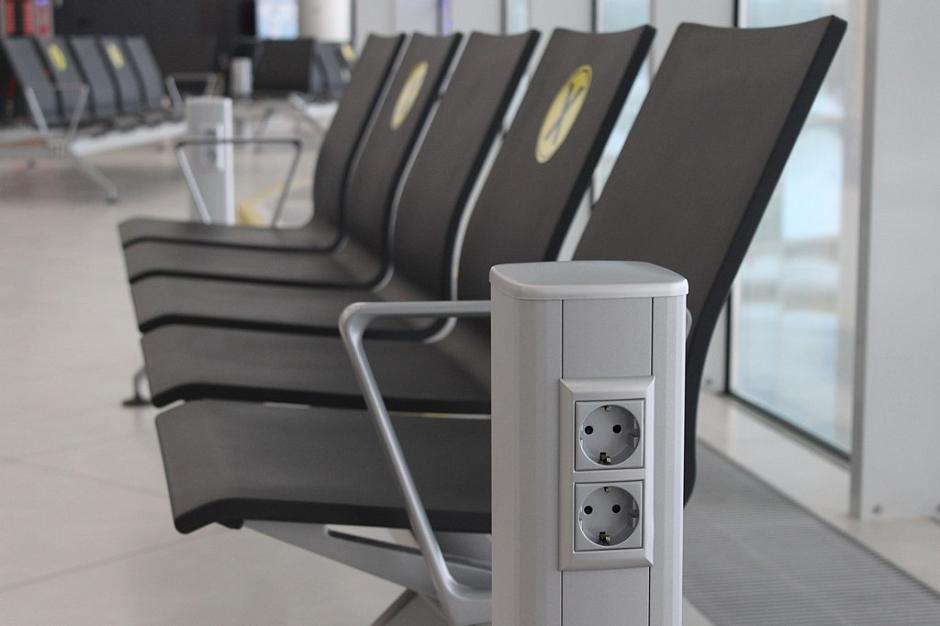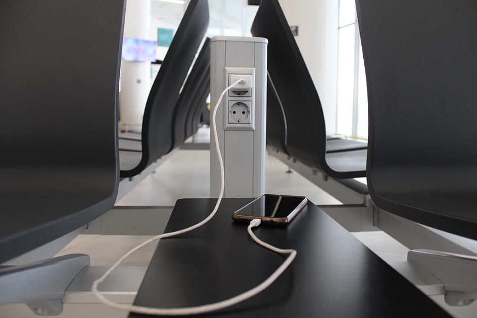Стойки для зарядки гаджетов уже установлены в зонах пребывания пассажиров на первом и втором этажах общей зоны аэровокзального комплекса, в зоне ожидания вылетов внутренних воздушных линий. В ближайшее время они появятся и в зале вылета международных воздушных линий.