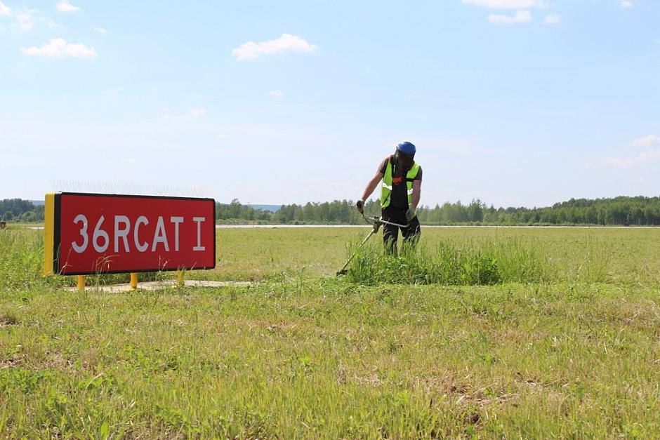 Покос производится в постоянном режиме, в зависимости от погодных условий и обилия осадков от трёх до пяти раз за сезон. Выкашивание травы производится на всей территории аэродрома, а также на расстоянии трёх метров от периметрового ограждения аэропорта на общей площади более 350 гектаров. Для обработки аэропорт Стригино использует косилки «Стриж» и широкозахватную косилку Multicut spearhead 620r.
