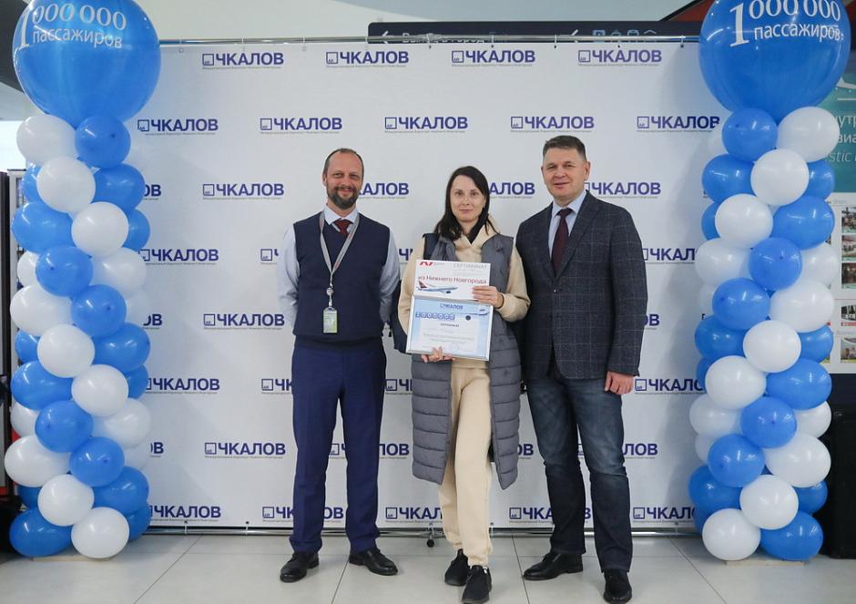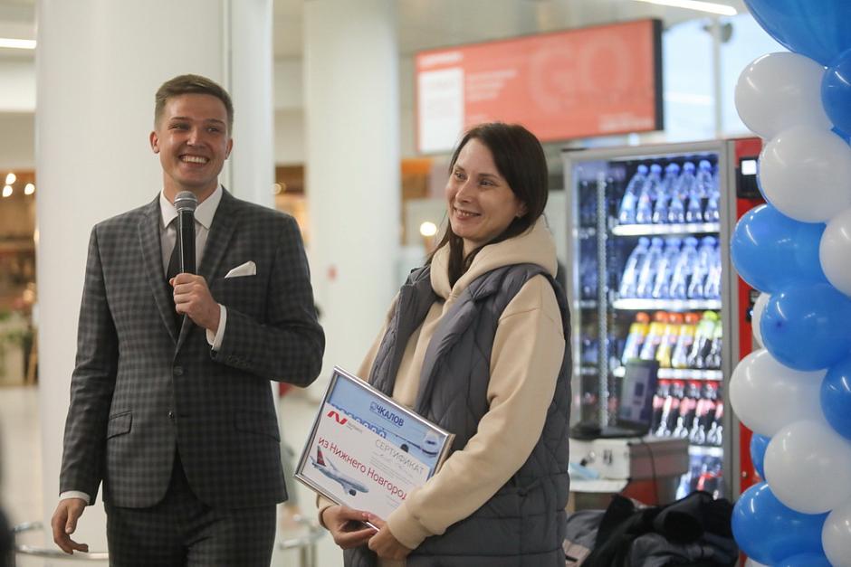 Эдуард Кошенсков вручил юбилейному пассажиру сертификат на право бесплатного посещения залов повышенной комфортности аэропорта в течение года на два лица. Кирилл Харченко подарил сертификат на бесплатный перелет в рамках маршрутной сети авиакомпании Nordwind из Нижнего Новгорода.
