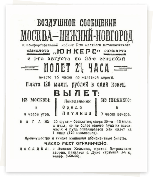 На рекламной листовке 1923 года значится, что теперь добраться в Москву можно всего за 2,5 часа вместо 16, которые занимала дорога на поезде. Правда, заплатить за такое скоростное преимущество предстояло немало: 120 миллионов рублей в один конец (примерно треть зарплаты для рядового сотрудника того времени).